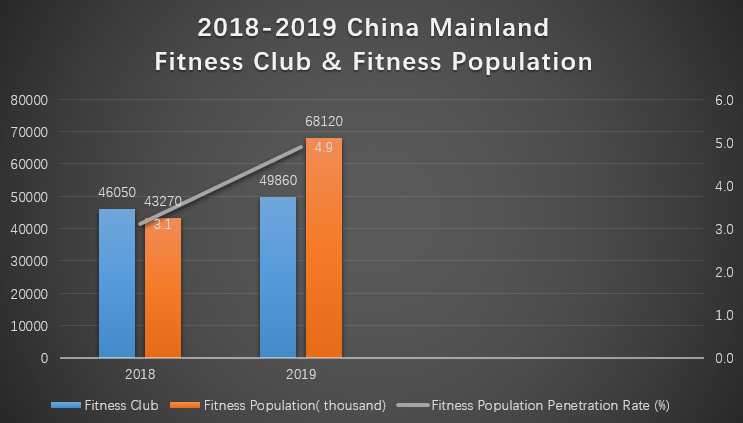 2019 թվականին Չինաստանի ֆիթնես արդյունաբերության ֆիթնես ոլորտի բնակչության ընդհանուր թիվը կազմել է մոտ 68.12 միլիոն, ինչը անդամների բացարձակ թվի առումով ավելի բարձր է, քան ԱՄՆ-ում։ Սակայն, 1.395 միլիարդ ընդհանուր բնակչության դեպքում, Չինաստանում ֆիթնես ոլորտի բնակչության 4.9%-ի ներթափանցման մակարդակը շատ ցածր է։ ԱՄՆ-ում այս մակարդակը կազմում է 20.3%, որը 4.1 անգամ ավելի բարձր է, քան Չինաստանում։ Եվրոպայի միջին մակարդակը կազմում է 10.1%, որը 2.1 անգամ ավելի բարձր է, քան Չինաստանում։